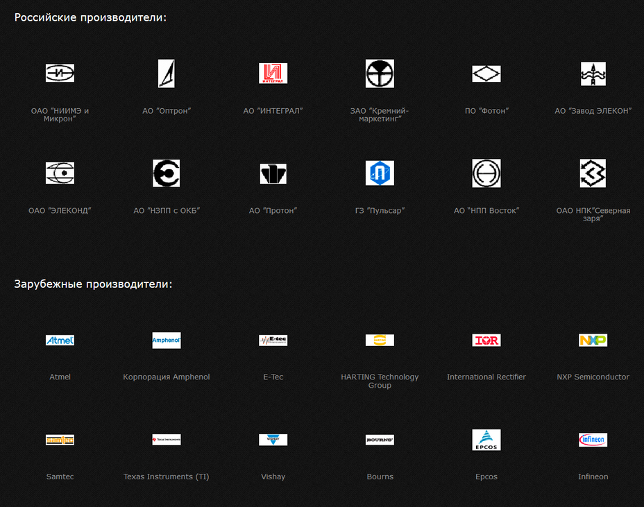 • Электрические соединители (разъемы), интегральные микросхемы, транзисторы, диоды, стабилитроны, светодиоды, оптоэлектронные приборы, пьезоэлектрические приборы, электромагнитные реле, контакторы, трансформаторы, дроссели, линии задержки, индуктивности, переключатели, кнопки, тумблеры, предохранители, кабели, провода, и многие другие комплектующие изделия. Наименования поставляемых изделий исчисляются десятками тысяч типов и типономиналов.